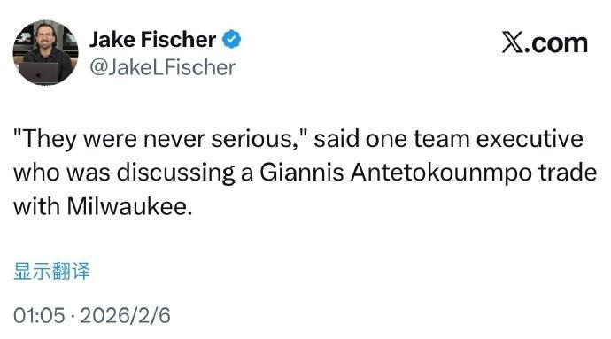 根据名记Shams报道,雄鹿已经正式告知各支球队,他们将在交易截止日前留下字母哥。至于另一位名记Jake Fischer补充报道表示,一位与雄鹿讨论过字母哥交易的球队高管透露,雄鹿从未与其他球队认真讨论过关于字母哥的交易。