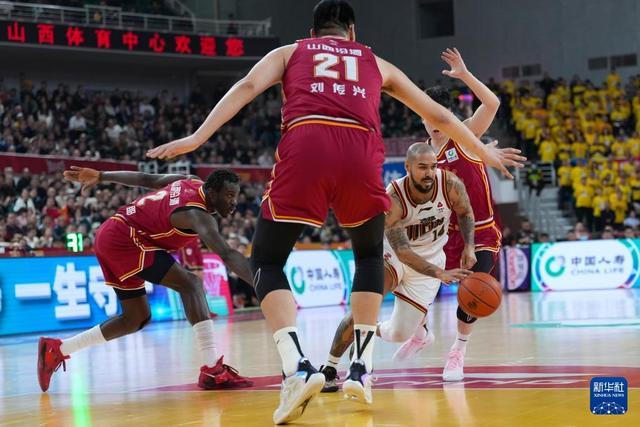 3月11日,山西汾酒队球员于米提(中)在比赛中运球突破。新华社记者 杨晨光 摄